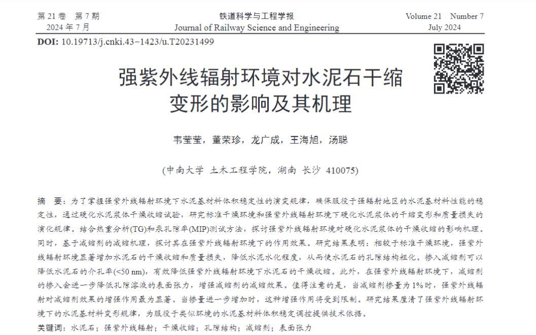 摘要:為了掌握強紫外線輻射環(huán)境下水泥基材料體積穩(wěn)定性的演變規(guī)律,確保服役于強輻射地區(qū)的水泥基材料性能的穩(wěn)定性,通過硬化水泥漿體干燥收縮試驗,研究標準干燥環(huán)境和強紫外線輻射環(huán)境下硬化水泥漿體的干縮變形和質(zhì)量損失的演化規(guī)律。結(jié)合熱重分析(TG)和汞孔隙率(MIP)測試方法,探討強紫外線輻射環(huán)境對硬化水泥漿體的干燥收縮的影響機理。