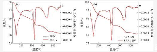通過TG-DTG程度對比分析60 d齡期時2種環(huán)境條件下水泥水化,熱重分析結(jié)果圖6和表4所示?;瘜W(xué)結(jié)合水和氫氧化鈣的含量可以直觀地反映水化速率和水化程度。如表4所示,經(jīng)過強紫外線照射后,各組樣品的化學(xué)結(jié)合水含量和氫氧化鈣含量呈下降趨勢,這是因為強紫外線照射下樣品中的自由水會更快地蒸發(fā),最終導(dǎo)致水化程度降低。此外,對比2種環(huán)境下的碳酸鈣含量發(fā)現(xiàn),強紫外輻射會促進水泥石的碳化。熱重分析結(jié)果與已有的研究結(jié)果相似。