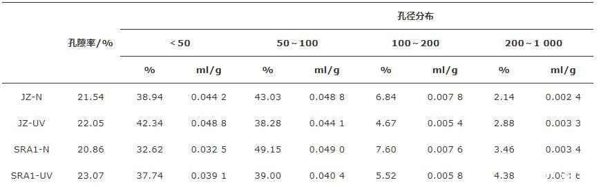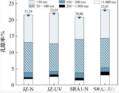 由圖7和表5可以看出:強紫外線輻射使各組樣品的總孔隙率、介孔率(2~50 nm)及大孔率(尤其是200 nm以上的孔)增加,由于彎月面的表面張力效應(yīng),介孔的毛細管產(chǎn)生更高的毛細管應(yīng)力,導(dǎo)致暴露在強紫外輻射環(huán)境中的水泥石產(chǎn)生更大的干燥收縮。同時,經(jīng)過強紫外線照射后,樣品中大于200 nm的孔隙比例增加。這是由于強紫外線輻射環(huán)境下,水泥凈漿的水化程度降低及水分散失增加導(dǎo)致的。
