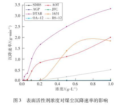 由表4和圖3可以看到,當(dāng)濃度為0.1 g/L時(shí),煤塵在AOT和APG溶液中的沉降時(shí)間不到1 min,而在陽離子和兩性型表面活性劑溶液中的沉降時(shí)間超過1 h。在同一濃度下,煤塵在不同表面活性劑溶液中的沉降時(shí)間相差較大,表面活性劑自身性質(zhì)影響潤濕煤塵的作用。當(dāng)濃度增大到各表面活性劑的臨界膠束濃度附近時(shí),煤塵在陰離子和非離子表面活性劑中的沉降時(shí)間會急劇下降,縮短至5 min之內(nèi),但在陽離子和兩性型表面活性劑中沉降時(shí)間依然大于1 h??傮w而言,8種表面活性劑潤濕煤塵的能力由強(qiáng)到弱依次排序?yàn)椋篈PG>AOT>JFC>SDBS>OA-12>BS-12>1631>CTAB,這與表面活性劑降低表面張力的能力排序基本一致。陽離子表面活性劑潤濕煤塵效果最差,主要是因?yàn)橛H水頭基的正電荷與煤塵所帶負(fù)電荷之間的靜電力大于疏水基團(tuán)之間的范德華力,形成了親水基團(tuán)朝向煤塵表面、疏水基團(tuán)朝向水的單分子膜,不利于潤濕。APG潤濕煤塵效果最好主要與其自身結(jié)構(gòu)有關(guān),APG分子結(jié)構(gòu)碳原子上的醇羥基與水分子之間存在強(qiáng)烈相互作用,間接弱化了烷基糖苷分子結(jié)構(gòu)中親水基團(tuán)與煙煤表面含氧親水官能團(tuán)之間的吸附作用,更有利于疏水基團(tuán)與煤塵表面的疏水基團(tuán)發(fā)生強(qiáng)烈相互作用,以親水頭基伸向溶液,疏水尾部吸附在煤塵上的方式排列,降低了溶液及固-液界面張力,增加了煤塵親水性。APG濃度達(dá)到0.02 g/L時(shí),煤塵沉降時(shí)間僅為057 min,沉降速率為0.18 g/min,潤濕煤塵效果良好,當(dāng)濃度繼續(xù)增大,潤濕煤塵作用變化不大,綜合考慮成本及效率后,選擇濃度為0.02 g/L的APG作為低階煤用噴霧抑塵法的添加劑。