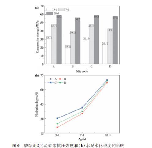圖6減縮劑對(a)砂漿抗壓強(qiáng)度和(b)水泥水化程度的影響