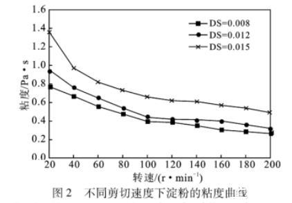 粘度是反映液體流變性能最常用的指標(biāo),粘度越小其流變性越高。由圖2可知,在同一轉(zhuǎn)速下,隨著取代度的增加,棕櫚酸酯淀粉糊液粘度升高;隨轉(zhuǎn)速增大,粘度先急劇下降后逐漸趨向平緩。棕櫚酸酯淀粉糊液粘度隨剪切速率的增大而減小,呈現(xiàn)“剪切稀化”特性,屬假塑性流體。淀粉糊液“剪切稀化”的程度與分子鏈的長(zhǎng)短有關(guān),高DS淀粉酯相對(duì)分子質(zhì)量較高,“剪切稀化”程度也較大。淀粉糊液表觀粘度隨著剪切速率的增大而降低,表明淀粉凝膠網(wǎng)絡(luò)體系中分子間或分子內(nèi)的作用力(氫鍵)在較高的剪切速率下更容易被破壞。當(dāng)剪切速率繼續(xù)增加到淀粉分子纏結(jié)點(diǎn)、范德華力作用點(diǎn)被破壞完全來不及重建時(shí),淀粉糊液表觀粘度趨于最小值。