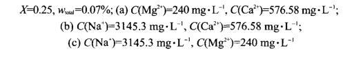 配制溶液所用的是高礦化度且含有高濃度二價(jià)金屬離子的模擬礦化水,從上面的實(shí)驗(yàn)結(jié)果中看出,HDAPS/SDS混合體系在高鹽條件下可以與原油達(dá)到超低界面張力??紤]到在實(shí)際應(yīng)用過(guò)程中地層水的礦化度可能發(fā)生變化,恒定模擬水中Na+、Mg2+和Ca2+中兩種金屬離子的濃度,考察了Na+、Mg2+和Ca2+濃度變化對(duì)HDAPS/SDS混合體系與原油界面張力的影響,實(shí)驗(yàn)結(jié)果如圖3所示。從圖中可以看出,模擬水中Na+濃度在1500-4500 mg·L-1、Mg2+濃度在120-360 mg·L-1和Ca2+濃度在200-800 mg·L-1范圍內(nèi)變化時(shí),HDAPS/SDS混合體系與原油的界面張力均可達(dá)到超低界面張力,這說(shuō)明在高礦化度和高濃度二價(jià)金屬離子條件下,HDAPS/SDS混合體系也表現(xiàn)出非常優(yōu)異的界面活性。