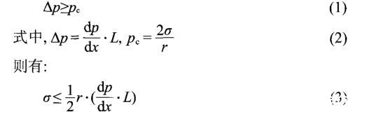 第三,HDAPS/SDS混合體系的動(dòng)態(tài)界面張力達(dá)到超低界面張力的時(shí)間非常短,且能夠在極低的平衡界面張力下維持。由于在實(shí)際驅(qū)油過(guò)程中,驅(qū)油體系是在流動(dòng)的狀態(tài)下與原油接觸,在短時(shí)間內(nèi)達(dá)到超低界面張力,對(duì)原油從巖石上啟動(dòng)非常有利。而且,HDAPS/SDS混合體系與原油的界面張力在總濃度超過(guò)0.04%后就可以達(dá)到極低的10-5mN·m-1量級(jí)。對(duì)于存在于半徑為r的毛細(xì)管中長(zhǎng)度為L(zhǎng)的剩余油滴,當(dāng)油滴兩端的驅(qū)動(dòng)壓差Δp大于等于毛細(xì)管壓力pc時(shí),剩余油滴才能夠活化啟動(dòng),7即有:
