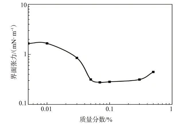 根據(jù)吉布斯吸附理論,為了達到超低油/水界面張力,表面活性劑分別與油相和水相發(fā)生強的相互作用并且在油水界面達到飽和吸附。這要求表面活性劑同時具有大的親水基和疏水基。不同濃度的表面活性劑TPHS溶液與大慶原油間的界面張力如圖3所示,隨著表面活性劑TPHS質(zhì)量分?jǐn)?shù)的增大,界面張力先減小后緩慢增大,在較大的濃度范圍內(nèi)可保持在10-1mN/m數(shù)量級。TPHS質(zhì)量分?jǐn)?shù)為0.07%時,界面張力達到最低,為0.276 mN/m。TPHS具有較好的降低油水界面張力的能力。