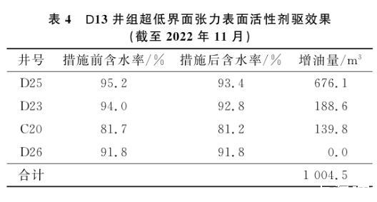 油藏評(píng)估結(jié)果顯示,D13井所控區(qū)域剩余可采儲(chǔ)量約6.7×104m3,剩余可采儲(chǔ)量較大。為挖掘該井所控區(qū)域油藏潛力,2022年4月開始對(duì)該井進(jìn)行超低界面張力表面活性劑驅(qū)油先導(dǎo)性試驗(yàn),2022年10月結(jié)束,共計(jì)注入表面活性劑溶液3 600 m3??紤]到滯留損失,試驗(yàn)將表面活性劑質(zhì)量分?jǐn)?shù)設(shè)計(jì)為0.3%。在注入過程中,注入壓力由8.9 MPa逐漸上升至10.2 MPa,分析認(rèn)為表面活性劑在地層中將剩余油乳化,乳化形成的油滴產(chǎn)生疊加的賈敏效應(yīng)所致。從表3的試驗(yàn)結(jié)果可知,截至2022年11月,施工結(jié)束1個(gè)月后,D13井對(duì)應(yīng)4口生產(chǎn)井中,除D26井因注采井距相對(duì)較遠(yuǎn),尚未見效外,其余3口井均已開始逐漸見效。見效井含水率下降0.5%~1.8%,1個(gè)月內(nèi)已實(shí)現(xiàn)在水驅(qū)基礎(chǔ)上增油1 004.5 m3,這說明超低界面張力表面活性劑能實(shí)現(xiàn)剩余油的有效啟動(dòng)。