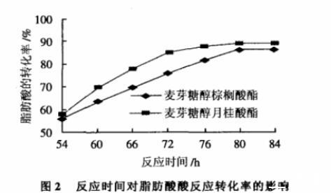 綜合上述實(shí)驗(yàn)結(jié)果,以脂肪酶Novozym 435為催化劑,用量為0.24g/mmol脂肪酸,脂肪酸用量為1mmol,麥芽糖醇用量為2.0mmol,溶劑用量為10mL,在60℃條件下反應(yīng)80h,棕櫚酸和月桂酸的轉(zhuǎn)化率分別達(dá)91%和95%。該結(jié)果是本實(shí)驗(yàn)條件范圍內(nèi)的最好結(jié)果。