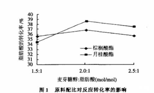 由圖1可知,在原料配比麥芽糖醇:脂肪酸酸分別使用1.5:1、2:1、2.5:1進(jìn)行反應(yīng)時(shí),麥芽糖醇:脂肪酸為2:1時(shí),脂肪酸的反應(yīng)轉(zhuǎn)化率是最好的,但是,結(jié)果相差不大。即在本實(shí)驗(yàn)條件下原料配比對(duì)反應(yīng)的影響較小。分析原因,是因?yàn)辂溠刻谴己椭舅釣榛ゲ幌嗳荏w系,在反應(yīng)中,用丙酮做溶劑,即使能建立一個(gè)均相的反應(yīng)體系,由于麥芽糖醇在丙酮中的溶解度比較小,溶液中隨麥芽糖醇的量增加而改變不大。而當(dāng)麥芽糖醇達(dá)到一定用量后,會(huì)破壞原有的平衡,導(dǎo)致脂肪酸反應(yīng)的轉(zhuǎn)化率降低。所以,反應(yīng)中選擇麥芽糖醇:脂肪酸的配比為2:1為反應(yīng)的最佳配比。