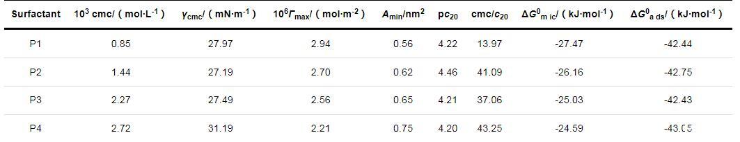 利用ΔG0a ds和ΔG0m ic表征表面活性劑的熱力學性質(zhì)。P1,P2,P3和P4的ΔG0a ds和ΔG0m ic均小于0,說明表面活性劑在氣/液界面層上的吸附行為以及在水溶液中形成膠束的行為是自發(fā)進行的。4種表面活性劑的ΔG0a ds均小于ΔG0m ic,表明表面活性劑分子在溶液中會先形成吸附層,當氣/液界面吸附達到飽和狀態(tài)后才開始在溶液內(nèi)部形成膠束聚集體。