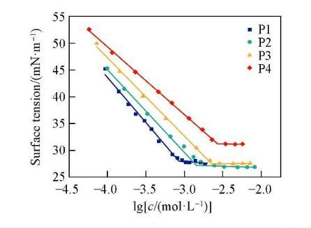 為研究4種非離子Gemini表面活性劑的表面活性,采用液滴體積法測定了不同濃度下的表面張力。圖2示出P1,P2,P3和P4的溶液表面張力與濃度對數(shù)的關(guān)系。溶液的表面張力隨濃度的增加而降低,當溶液的濃度高于cmc后,表面張力達到最低值并基本趨于穩(wěn)定。這是由于隨著表面活性劑濃度的升高,在氣/液界面上吸附的表面活性劑分子數(shù)量增多,界面上的分子排列越來越緊密,表面張力持續(xù)下降;當表面活性劑濃度達到cmc后,溶液內(nèi)部的分子開始聚集形成膠束聚集體,表面活性劑分子在界面上達到飽和吸附,因此cmc之后表面張力趨于穩(wěn)定。