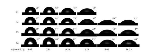 由圖2可知,P1,P2,P3和P4的cmc分別為8.51×10-4,1.44×10-3,2.27×10-3和2.72×10-3 mol/L;γcmc分別為27.97,27.19,27.49和31.19 mN/m.可見,隨著聚氧乙烯鏈長度的增加,4種非離子Gemini表面活性劑的cmc逐漸增加,這是由于隨著聚氧乙烯鏈長度的增加,表面活性劑的疏水作用減弱,不利于膠束的形成。γcmc隨著聚氧乙烯鏈長度的增加先減小后增加,其中P2的γcmc最低,為27.19 mN/m,這可能是由于P2分子內(nèi)部的親水性和疏水性達到了平衡,能穩(wěn)定排列在氣/液界面上,降低表面張力的能力最強。P2,P3和P4的γcmc隨著聚氧乙烯鏈長度的增加逐漸升高,這是由于親水性聚氧乙烯鏈長度的增加使得表面活性劑分子在水溶液中卷曲程度增大,在界面處占據(jù)的空間增大,降低了分子在界面上的鋪展緊密度,從而導致γcmc升高。