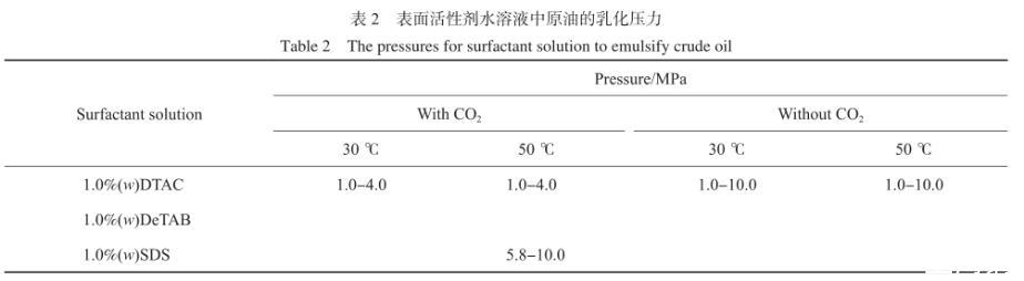 實(shí)驗(yàn)中觀察到原油的乳化情況與體系壓力及CO2存在與否的相關(guān)性,表2是CO2存在與CO2不存在條件下,1.0~10.0 MPa范圍內(nèi),表面活性劑水溶液中原油的乳化壓力。50℃時(shí),在DTAC水溶液/原油體系中,CO2不存在時(shí),水靜壓在1.0~10.0 MPa范圍內(nèi),始終存在原油的乳化現(xiàn)象。CO2存在時(shí),體系壓力低于4.0 MPa時(shí),存在原油的乳化現(xiàn)象,隨著CO2壓力升高,油水界面張力增大,原油乳化現(xiàn)象消失。說(shuō)明在DTAC水溶液/原油體系中,CO2的存在不利于原油的乳化。50℃時(shí),在SDS水溶液/原油體系中,CO2不存在時(shí),水靜壓從1.0 MPa升高至10.0 MPa過(guò)程中,始終未出現(xiàn)原油的乳化現(xiàn)象。CO2存在時(shí),體系壓力升高到5.8 MPa以上,原油開(kāi)始出現(xiàn)乳化、拉絲的現(xiàn)象。這說(shuō)明CO2的存在有利于SDS水溶液乳化原油。其原因如下:一方面CO2的存在降低了SDS水溶液與原油的界面張力;另一方面,CO2通過(guò)水相擴(kuò)散進(jìn)入原油中,降低了原油的黏度,增強(qiáng)了原油的流動(dòng)性,同時(shí)CO2對(duì)原油中輕質(zhì)組分的萃取,也有助于原油中的輕質(zhì)組分?jǐn)U散進(jìn)入水相。因此高壓CO2增強(qiáng)了SDS水溶液對(duì)原油的乳化作用。在DeTAB水溶液/原油體系中,油水界面張力較大,無(wú)論CO2存在與否,始終沒(méi)有原油乳化現(xiàn)象的發(fā)生。