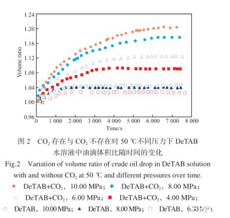 圖2為50℃下,CO2存在與CO2不存在時(shí),DeTAB水溶液/原油體系中,油滴的體積與初始體積比隨時(shí)間的變化。由圖2可知,對(duì)于原油/CO2/DeTAB水溶液體系,在初始階段,油滴體積增加較快,在油滴體積增加到平衡值附近后,體積增加變緩慢。油滴體積達(dá)到穩(wěn)定所需時(shí)間在3 500~6 500 s范圍內(nèi)。同時(shí),隨著壓力的升高,油滴的平衡體積與初始體積比逐漸增大,這與原油體積膨脹系數(shù)隨著CO2壓力增大而增大相吻合。不含CO2的DeTAB水溶液/原油體系中,油滴體積達(dá)到平衡值所需時(shí)間在1 300 s左右,遠(yuǎn)小于CO2存在時(shí)達(dá)到平衡狀態(tài)所需的時(shí)間;同時(shí),油滴體積的增加幅度明顯低于CO2存在時(shí)的情況。CO2存在時(shí),DeTAB水溶液/原油體系中,油滴體積的明顯增大,說(shuō)明水中溶解的CO2可以有效地?cái)U(kuò)散進(jìn)入油相中,實(shí)現(xiàn)其對(duì)原油的溶脹效果,這將利于將油藏孔隙中的一部分殘余油排出,從而提高油田采收率。