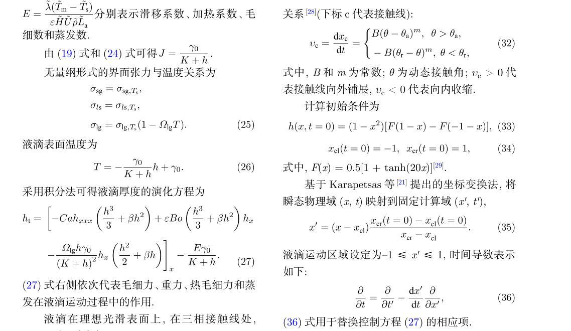 液滴運動區(qū)域設(shè)定為–1≤x'≤1,時間導數(shù)表示如下: