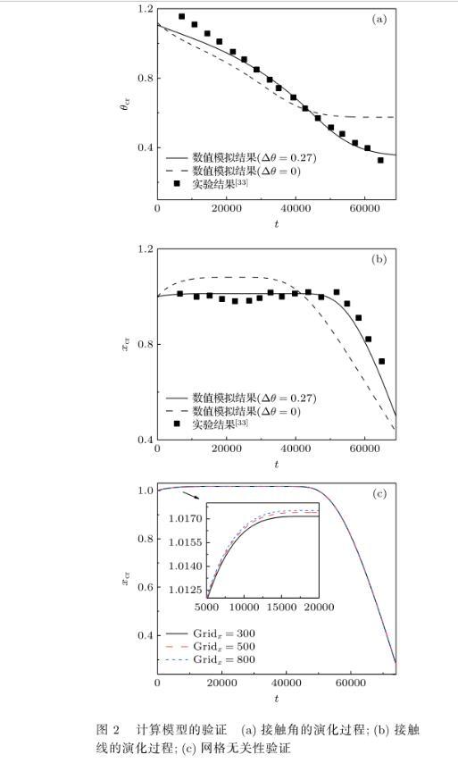 圖2計算模型的驗證(a)接觸角的演化過程;(b)接觸線的演化過程;(c)網(wǎng)格無關(guān)性驗證