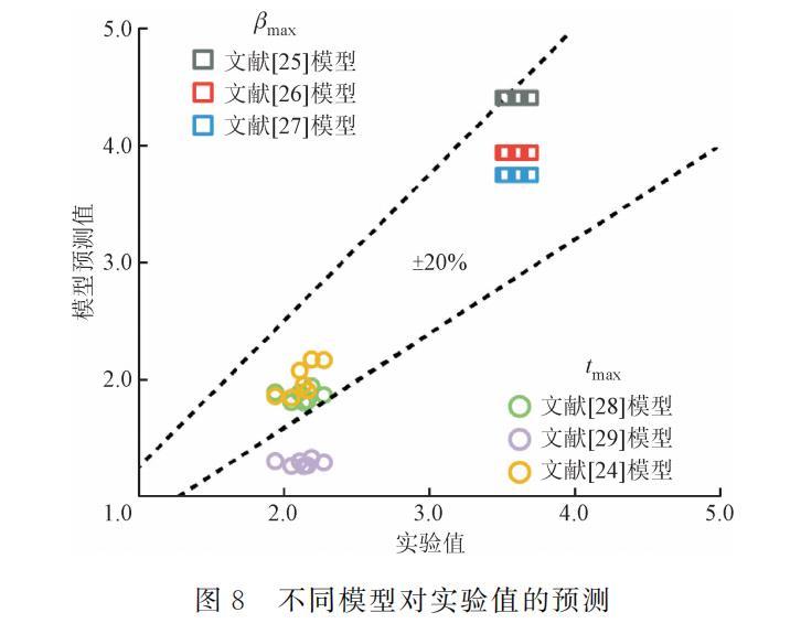 式中:tmax,pre和βmax,pre為使用各模型的最大鋪展時間和最大鋪展因子預測值;tmax,exp和βmax,exp為最大鋪展時間和最大鋪展因子實驗值。如圖8所示,不同公式的預測結(jié)果不同,對于最大鋪展因子,盡管不同學者提出的表達式對實驗結(jié)果的預測準確率均較好,單個數(shù)據(jù)點的偏差均在20%以內(nèi),然而由于表達式的限制,無法針對液滴沖擊不同水平壁面過冷度的實驗工況進行預測,存在一定缺陷。對于最大鋪展時間,Huang和Chen等人提出的表達式預測效果較差,Wildeman等提出的表達式預測效果較好,相對平均偏差為12.32%,但由于其表達式內(nèi)不包含水平壁面過冷度的影響因素,因而預測效果略差于Shang等提出的表達式,其相對平均偏差為6.05%。綜上所述,現(xiàn)有最大鋪展時間的表達式能較好預測乙醇液滴沖擊過冷水平壁面的鋪展動力學行為,但最大鋪展因子表達式仍需進一步探索。