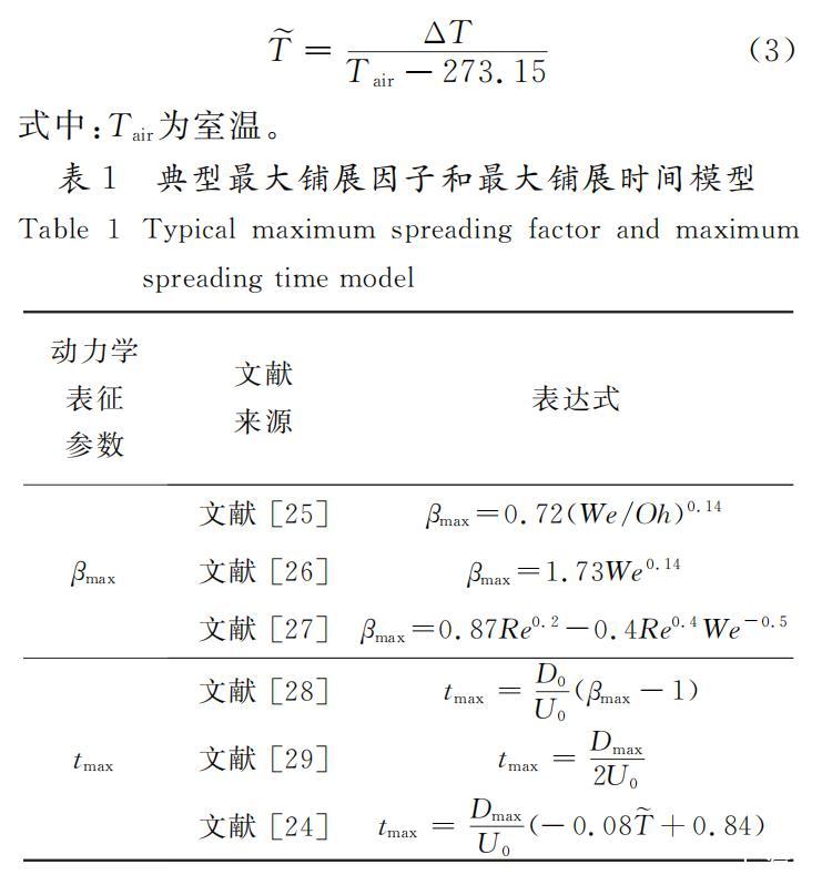 如表1所示,Bayer和Megaridis認為液滴沖擊水平壁面的最大鋪展因子與韋伯數(shù)、奧內(nèi)佐格數(shù)有關(guān),并提出了相關(guān)關(guān)聯(lián)式。Roisman認為最大鋪展因子與雷諾數(shù)、韋伯數(shù)均有關(guān),他采用半假設半理論的方法,從動量守恒理論出發(fā),提出了最大鋪展因子的表達式。針對最大鋪展時間,Wildeman等認為,最大鋪展時間與最大鋪展因子有關(guān),結(jié)合實驗數(shù)據(jù),對最大鋪展時間進行了修正。Shang等探究了水滴沖擊過冷水平壁面的鋪展動力學行為,并將水平壁面過冷度引入最大鋪展時間模型,重新定義無量綱過冷溫度