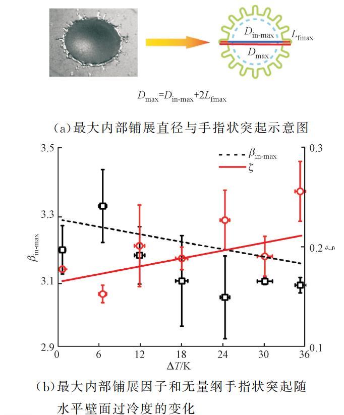 為了揭示βmax隨水平壁面過冷度的這一非單調(diào)變化,將βmax分為兩部分,并分別研究各部分與乙醇濃度的關(guān)系。如圖7(a)所示,βmax包含內(nèi)部鋪展無量綱直徑βin-max=Din-max/D0,以及邊緣的無量綱指狀長度ζ=LfmaxD0,其中Din-max為液滴鋪展到最大程度的內(nèi)部鋪展直徑,Lfmax為液滴鋪展至最大的指狀長度。當ζ<0.15時,認為液滴不形成指狀突起,當ζ≥0.15時,認為液滴形成指狀突起。