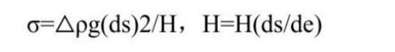 在(25±0.1)℃下使用光學(xué)測量儀,使用注射器注射液體呈現(xiàn)出最大直徑de的液滴時,通過L-Y方程計算液體的表面張力σ的大小。對于每個溶液的表面張力值計算四次測量的平均值,以減小實(shí)驗(yàn)誤差,表面張力(mN/m)的計算如下面所示: