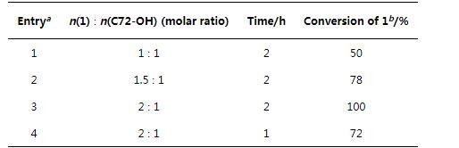 我們將原料1和C72-OH等物質(zhì)的量比混合,以超干四氫呋喃(THF)為溶劑,在0℃下進(jìn)行反應(yīng),2 h后通過(guò)核磁氫譜(1H NMR)觀測(cè)到有產(chǎn)物生成。但原料C72-OH的轉(zhuǎn)化率僅為50%(表1,Entry 1)。因此,我們對(duì)反應(yīng)物的比例、反應(yīng)時(shí)間做進(jìn)一步優(yōu)化。結(jié)果顯示:在原料1與原料C72-OH物質(zhì)的量比為2∶1,反應(yīng)時(shí)間為2 h的條件下,原料C72-OH可完全轉(zhuǎn)化(表1,Entry 3)。接下來(lái),我們將中間體C72-P與3 equiv.三甲胺(2 mol/L in THF)溶解在乙腈中,在70℃下反應(yīng)48 h,高產(chǎn)率得到目標(biāo)產(chǎn)物C72-MPB.用類似方法合成了結(jié)構(gòu)相似的氟碳表面活性劑6:2-MPB(表2),并對(duì)比了C72-MPB與6:2-MPB的表面活性性能。