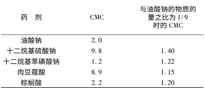表3油酸鈉與磺酸鹽和羧酸混合水溶液的表面活性參數(shù)(298 K)×10-3 mol/L