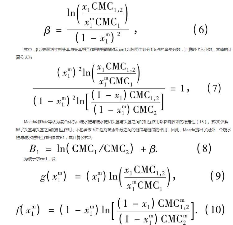 式中,β為表面活性劑頭基與頭基相互作用的強(qiáng)弱指標(biāo);xm1為膠團(tuán)中組分1所占的摩爾分?jǐn)?shù),計(jì)算時(shí)代入小數(shù),其值的計(jì)算公式為