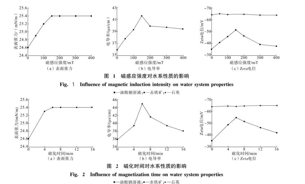 (2)表面張力、電導(dǎo)率和Zeta電位測(cè)試結(jié)果表明,磁化處理后溶液中油酸鈉離子濃度增加,油酸根離子在赤鐵礦表面的吸附增強(qiáng),有利于赤鐵礦和石英的浮選分離。