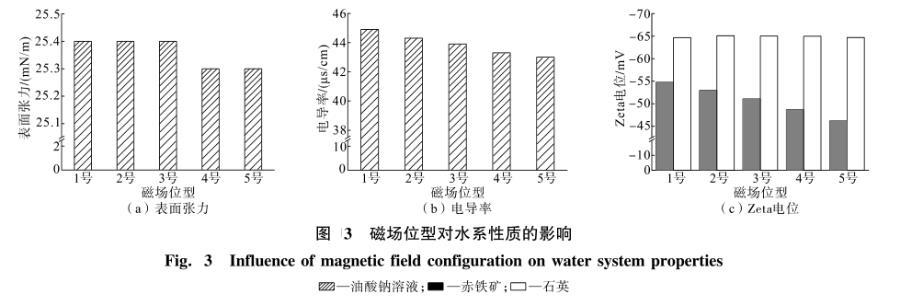 由圖3可知,1號(hào)磁場位型條件下,油酸鈉的表面張力、電導(dǎo)率和赤鐵礦的Zeta電位絕對(duì)值均最大。