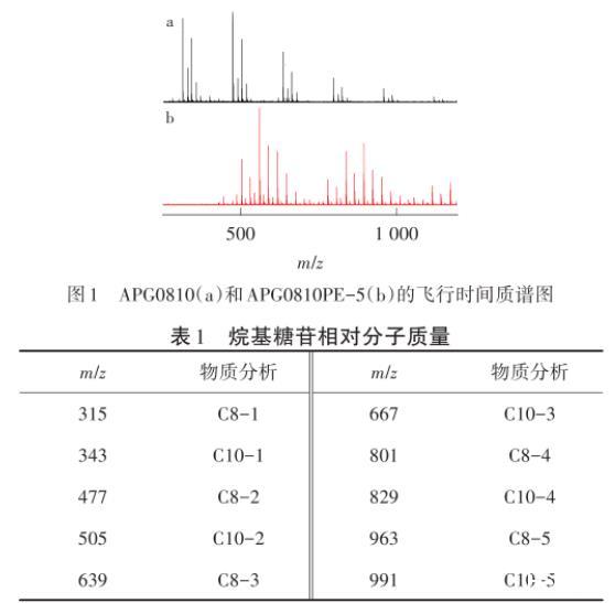 由圖1可以看出,m/z315表示單糖苷的C8烷基糖苷,m/z343表示單糖苷的C10烷基糖苷,m/z477與m/z315相差M(162),162表示一個葡萄糖脫掉一個水的相對分子質(zhì)量,APG0810的分子質(zhì)量組成分析如表1所示。