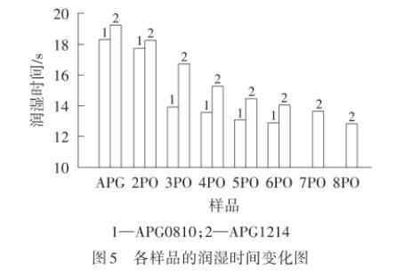 由圖5可以看出,APG0810PE-n和APG1214PEm的潤濕時間隨著PO加合數(shù)的增加而減少。這是因?yàn)楸砻婊钚詣┰跐駶櫡计瑫r,PO基團(tuán)的引入為分子提供疏水性,提高了分子與帆布片之間的疏水相互作用,促使分子易于吸附在帆布片表面,有利于潤濕。而APG1214和APG1214PE-m的潤濕時間比APG0810和APG0810PE-n長,說明隨著碳鏈增長,潤濕性能變差,這是因?yàn)榉肿娱L度增加打破了親水親油平衡狀態(tài),不利于潤濕。