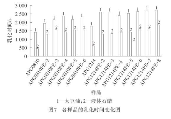 由圖7可以看出,采用乳液破乳時間表征表面活性劑的油水界面性質(zhì),APG1214和APG1214PE-m乳化大豆油以及液體石蠟的能力勝于APG0810以及APG0810PE-n,而且隨著PO加合數(shù)的增加而提高。這是由于PO基團(tuán)和烷基鏈增長提供了疏水性,增強(qiáng)了乳化劑分子的乳化能力,延長了破乳時間。此外,所有表面活性劑乳化大豆油的能力均明顯強(qiáng)于乳化液體石蠟,表明PO基團(tuán)可能具有類似極性作用,可以增強(qiáng)樣品與極性分子之間的協(xié)同作用,因此乳化性能更好。