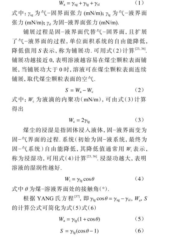 煤塵的浸濕是指固體浸入液體,固~液界面變?yōu)楣虀氣界面的過程。系統(tǒng)(初始為固~液系統(tǒng),最終為固~氣系統(tǒng))自由能降低,其降低值通常用Wi表示,稱為浸濕功,可用式(4)計算。浸濕功越大,表明溶液的濕潤性越好。