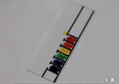 這個(gè)難度比較高,不過現(xiàn)象非常有意思。在這里使用的是含有丙二醇和水的液體食品色素,這些液滴經(jīng)過不同程度的稀釋。在非常潔凈的玻璃片上,它們因?yàn)檎舭l(fā)而產(chǎn)生表面張力的變化,從而出現(xiàn)彼此“追逐”的現(xiàn)象。詳情: