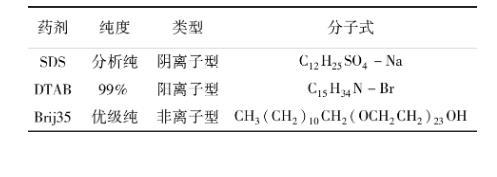 選用3種表面活性劑開展浮選精煤脫水過濾試驗(yàn)。3種表面活性劑分別為十二烷基硫酸鈉(SDS)、十二烷基三甲基溴化銨(DTAB)、月桂醇聚氧乙烯醚(Brij35)。3種藥劑的疏水端均為十二烷基,親水端分別為硫酸根、銨根以及聚氧乙烯醚,3種藥劑的物理化學(xué)性質(zhì)見表3。