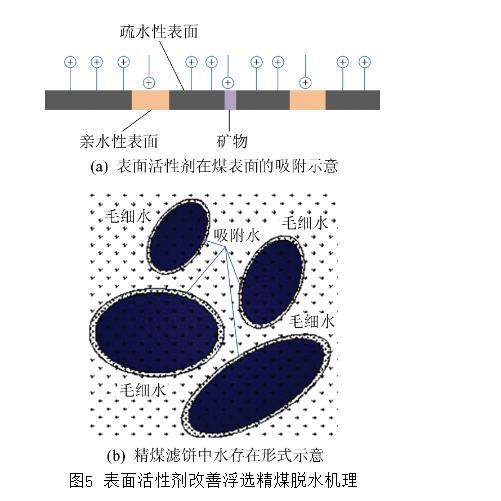 表面活性劑在煤表面的吸附可由圖5a解釋,親水基團主要與煤表面礦物質(zhì)或煤親水性表面發(fā)生吸附,疏水基團主要與煤表面疏水位點發(fā)生吸附。由于本次研究煤樣為煉焦煤精煤,其表面以疏水為主,這導(dǎo)致大部分表面活性劑的疏水基團與煤表面疏水區(qū)域發(fā)生吸附,使得表面活性劑親水基團暴露在外,因此煤表面親水性增加。煤表面親水性增加雖然會使煤表面水化膜變厚,吸附水能力增加,但該作用與表面活性劑促進毛細水的脫出效應(yīng)相比較小(圖5b)。因此,表面活性劑的存在雖使煤表面親水性上升,但使水的表面張力大幅降低,從而使煤粒間隙中的毛細水更容易在壓力的作用下排出,因此表面活性劑在此研究中降低了精煤濾餅中的水分。