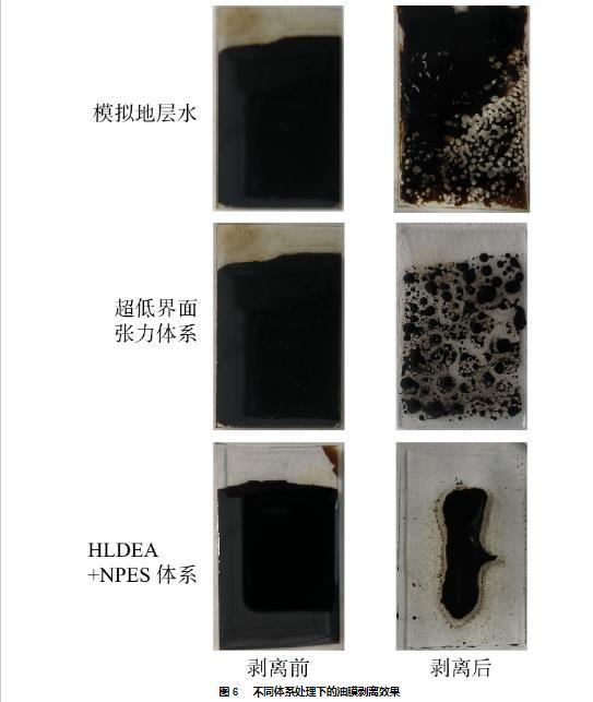 2)HLDEA+NPES體系可將油水界面張力降低至3.8×10?3 mN/m,水下油滴接觸角由41.34°增加至162.53°,使得24 h內(nèi)油膜剝離率高達(dá)75.3%。