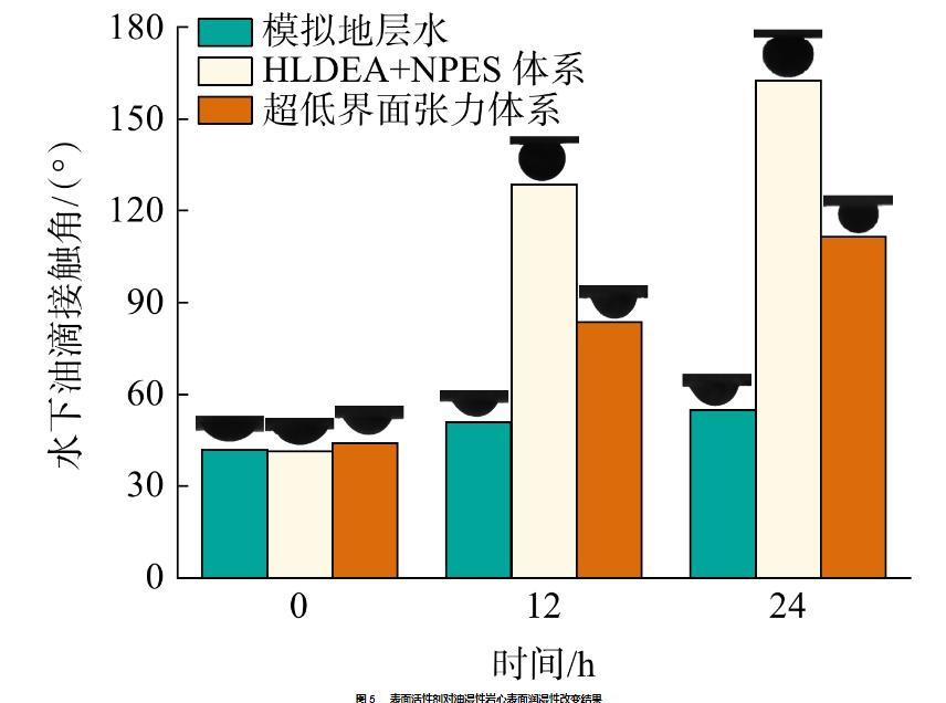 通過評價表面活性劑體系在親油巖心表面的潤濕性來考查體系潤濕調(diào)控能力,實驗結(jié)果如圖5所示。從圖5可知,地層水可較微弱地改變親油巖心表面潤濕性,但表面仍為親油表面。超低界面張力體系作用下,可在24 h內(nèi)將表面水下油滴接觸角由43.98°改性到111.35°。調(diào)控界面潤濕性效果最為顯著的是HLDEA+NPES體系,24 h內(nèi)水下油滴接觸角由41.34°增至162.53°,實現(xiàn)強(qiáng)親水改性。