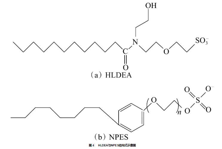 將配制好的穩(wěn)定性優(yōu)異的復(fù)配體系[0.15%(w)HLDEA+0.15%(w)助表面活性劑]置于75℃條件下,測定復(fù)配體系的油水界面張力,結(jié)果見圖3。由圖3可得,復(fù)配后體系油水界面張力隨時間均出現(xiàn)先下降后基本保持平衡的趨勢。HLDEA與兩種陰非離子型表面活性劑APEC-4Na和NPES復(fù)配后體系的油水界面張力降低至接近超低界面張力水平(10?3 mN·m?1)。這是因為HLDEA分子小、親油性高,其擴(kuò)散速度快且傾向于進(jìn)入油滴內(nèi)部,同時,溶液中的NPES分子隨時間推移逐步被吸引于油水界面,尾鏈與HLDEA分子相互糾纏形成緊密結(jié)構(gòu),提高了油水界面吸附膜的致密程度,從而使界面張力大幅降低。最終優(yōu)選出的助表面活性劑為NPES,在與HLDEA復(fù)配后體系界面張力值為3.8×10?3 mN/m。HLDEA與NPES結(jié)構(gòu)式見圖4。作為對比的超低界面張力體系油水界面張力值為2.9×10?4 mN/m,較HLDEA+NPES體系界面張力低了一個數(shù)量級。