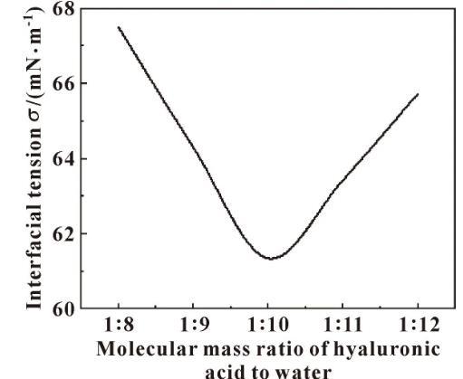 分子動力學中認為界面張力與不同方向上的壓力張量有關,仿生黏液透明質(zhì)酸體系-水的界面張力通過KIRKWOOD和BUFF提出的力學定義來進行計算。通過對5個不同質(zhì)量比的體系在平衡后200 ps的數(shù)據(jù)進行統(tǒng)計,得到了一個仿生黏液和水界面的界面張力平均結果,如圖1所示??梢娫谘芯康馁|(zhì)量比范圍內(nèi),透明質(zhì)酸仿生黏液與水的界面張力始終保持在(60.00±10)mN/m左右,其中透明質(zhì)酸和水分子的質(zhì)量比接近1∶10時,界面張力最小(為61.33 mN/m)。仿生黏液和水界面的界面張力越小,體系中仿生黏液和水界面的自由能就越低,界面就較穩(wěn)定。因此,可以認為在研究的質(zhì)量比范圍內(nèi),質(zhì)量比1∶10時,模擬黏液-水的界面穩(wěn)定性最優(yōu)。這同時也證明,通過分子動力學模擬的方法可以初步預測仿生黏液在水體中的穩(wěn)定性。