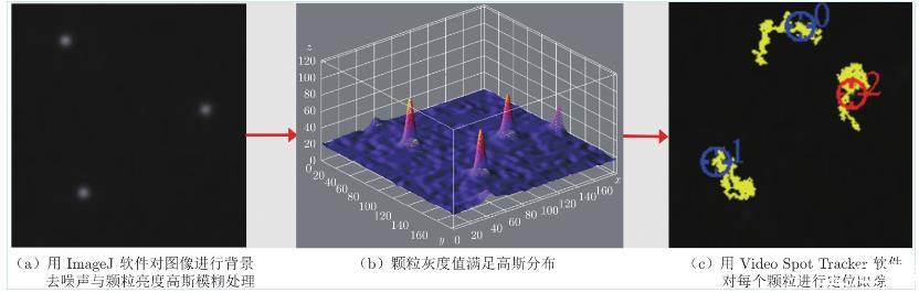 實(shí)驗(yàn)采用Olympus顯微鏡(配備60倍物鏡)觀察顆粒在膜上的布朗運(yùn)動(dòng),同時(shí)利用電子增益高速攝像機(jī)(Andor 897 EMCCD)進(jìn)行拍攝。每個(gè)視頻拍攝時(shí)間為200 s,幀頻為0.05 s,曝光時(shí)間5 ms,圖像尺寸為300像素×300像素,分辨率為0.26μm/m。采集原始圖像中的顆?;叶戎挡环蠘?biāo)準(zhǔn)高斯分布,因此使用圖像處理軟件ImageJ對(duì)圖像進(jìn)行背景去噪聲(Background Subtraction)和高斯模糊(Gauss-ian Blur)處理(圖3(a)),使顆粒灰度值達(dá)到標(biāo)準(zhǔn)高斯分布(圖3(b))。之后用Video Spot Tracker軟件定位每個(gè)顆粒的灰度峰值(圖3(c)),即顆粒質(zhì)心,定位誤差僅為0.5像素,進(jìn)而對(duì)顆粒二維運(yùn)動(dòng)軌跡(平面)進(jìn)行實(shí)時(shí)跟蹤。軟件自動(dòng)將顆粒在每一時(shí)刻的像素位置坐標(biāo)存入計(jì)算機(jī)中,使用MATLAB計(jì)算顆粒在不同時(shí)間間隔Δt內(nèi)沿和方向的位移,計(jì)算公式如下: