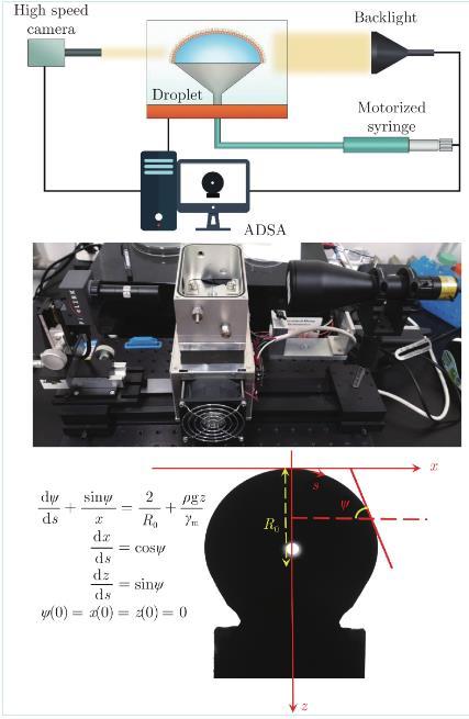 采用課題組自主研發(fā)的約束液滴表面測(cè)量?jī)x(Constrained Drop Surfactometry,CDS)測(cè)量膜在不同密度下的表面張力,如圖1所示,圖中x與z分別代表水平與豎直方向,s代表液滴表面切向方向,ψ為液滴表面與水平方向內(nèi)夾角,R0為液滴半徑,ρ為液滴密度,g為重力加速度。CDS上的圓形基座用于盛放純水液滴(約10μL),以微量進(jìn)樣針將稀釋的固爾蘇–氯仿溶液滴定到液滴表面,形成形狀類(lèi)似于肺泡的水?氣界面固爾蘇肺表面活性劑膜?;醒氲男】淄ㄟ^(guò)導(dǎo)管與注射器相連,注/抽水速度由Labview編程的推進(jìn)器控制,以此調(diào)節(jié)液滴表面積的變化速率。實(shí)驗(yàn)測(cè)量的是膜在壓縮過(guò)程中表面張力與膜密度變化的關(guān)系,液滴表面積以0.05的準(zhǔn)靜態(tài)速率縮小。液滴的輪廓由照相機(jī)拍攝。膜表面張力和表面積以ADSA(Axisymmetric Drop Shape Analysis)方法分析得出。膜表面壓強(qiáng),其中,純水表面張力。