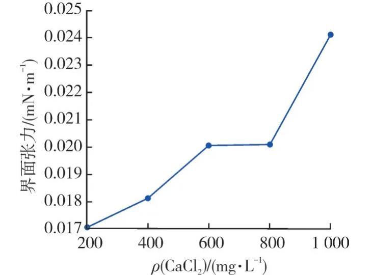 由圖4和5可知:隨著Na+濃度的增加,復配體系的油水界面張力值雖然不斷上升,但是當?shù)V化度上升至50 000 mg/L時,界面張力值增幅很小,僅增加了0.008 mN/m。當Ca2+質(zhì)量濃度增加至1 000 mg/L時,界面張力值增幅也很小,僅上升了0.007 mN/m。這兩種現(xiàn)象證明了隨著礦化度的增加,復配體系仍然具有較好的抗鹽性能,這也正是非離子表面活性劑的特點。