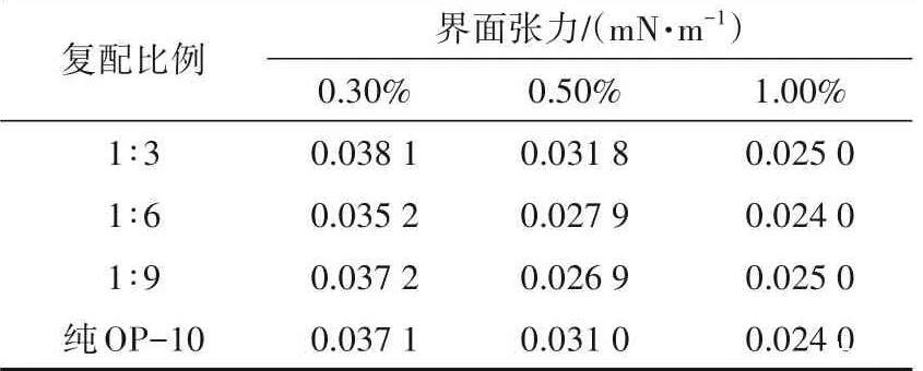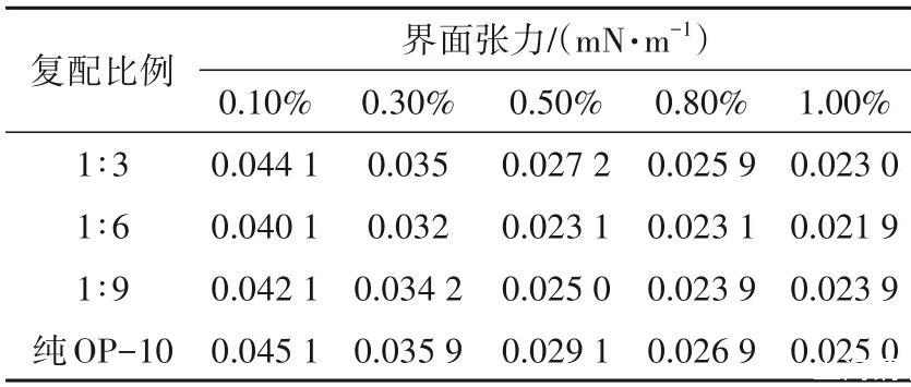 將HPAM配制成質(zhì)量分數(shù)為0.10%的水溶液,與不同濃度的OP-10按不同比例復配,并測定不同復配體系的界面活性,結果見表3。