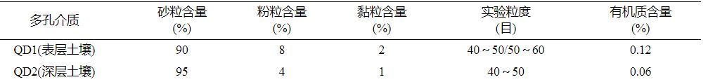 本研究選用的兩種多孔介質(zhì)分別為QD1(表層20~40cm土壤)和QD2(地下50~100cm深層土壤),均采自青島市嶗山區(qū)某農(nóng)田。經(jīng)過自然風干后,將其篩分為40~50目和50~60目。實驗選用土壤中的金屬氧化物含量均較低,主要差異為有機質(zhì)含量。土壤樣品的性質(zhì)見表1。