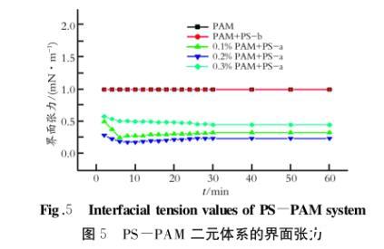 由圖5結(jié)果可知,PAM單元體系以及PAMPS-b二元體系,均不能降低原油的界面張力;為了便于在圖形中對(duì)比分析,將其界面張力設(shè)定為1.0 mN/m而PAM-PS-a二元體系可以將原油的界面張力維持在10-1數(shù)量級(jí),數(shù)值與PS-a單元體系的界面張力數(shù)值相近,因此可以得出:無(wú)論是PS單元體系,還是PAM-PS復(fù)配體系,PS-b均不能降低原油的界面張力。
