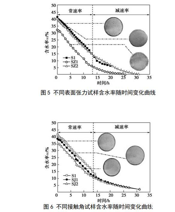 把篩好的土放入105℃烘箱內(nèi)烘至恒重備用。設(shè)計(jì)土樣的干密度為1.5 g/cm3,含水率計(jì)算不考慮酒精溶液和肥皂水引起的液體密度變化,制樣含水率為16%~18%。采用輕型擊實(shí)儀制圓柱試樣,試樣直徑為102 mm,高40 mm,試樣制好后用真空飽和法進(jìn)行飽和,其中,SZ1樣用20%酒精溶液飽和,SZ2樣用濃度為2 g/L的肥皂水飽和,其余試樣均為純水飽和,抽氣時(shí)間為6 h,試樣在真空下的浸泡時(shí)間為12 h。為縮短試樣的脫濕時(shí)間以減小酒精揮發(fā)造成的濃度降低,飽和試樣脫濕采用低溫烘干法,烘箱的溫度控制在50℃(小于酒精的沸點(diǎn)和十八胺的熔點(diǎn)),當(dāng)2h內(nèi)試樣的質(zhì)量變化量不超過(guò)2 g時(shí)停止試驗(yàn)。試驗(yàn)開(kāi)始后,前8 h每隔30 min把試樣從烘箱中取出后先稱重,隨后進(jìn)行拍照記錄,稱重和拍照的時(shí)間控制在30s內(nèi),拍照結(jié)束后把試樣放入烘箱繼續(xù)脫濕,6 h以后拍照間隔時(shí)間增加為1 h。2試驗(yàn)結(jié)果2.1水分蒸發(fā)與臨界含水率圖5給出了不同表面張力的3種試樣含水率隨時(shí)間變化的關(guān)系曲線。