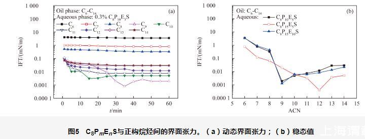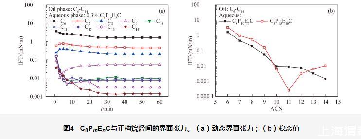 圖5 C8PmEnS與正構烷烴間的界面張力。(a)動態(tài)界面張力;(b)穩(wěn)態(tài)值