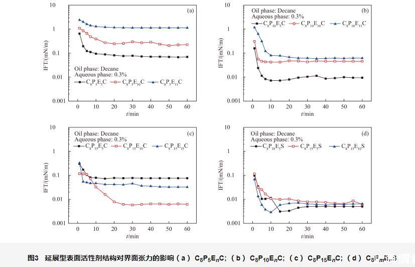 EO基團為弱親水基團,界面上表面活性劑分子的EO鏈傾向于伸入水相。當EO鏈過長時,整個表面活性劑分子呈現兩頭大、中間細的“啞鈴”狀結構,影響界面吸附膜的緊密程度,造成界面張力升高。根據羧酸鹽型延展型表面活性劑的結構-活性關系認識,選擇可能具備超低界面張力活性的硫酸鹽型延展型表面活性劑(C8P10E5S、C8P15E5S、C8P15E10S)進行界面張力測試,實驗結果見圖3d。與羧酸鹽類似,上述硫酸鹽型延展型表面活性劑均能將正癸烷的界面張力降至超低。總之,充足的PO數和少量的EO數是延展型表面活性劑獲得超低界面張力的先決條件。