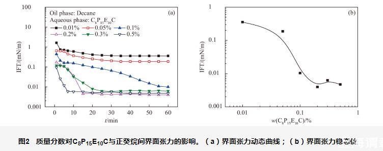 質量分數是影響表面活性劑溶液界面張力的基本因素。不同質量分數C8P15E10C溶液與正癸烷的動態(tài)界面張力見圖2a。可以看出,由于C8P15E10C分子不斷從體相向界面擴散并吸附,最終達到動態(tài)平衡,溶液的動態(tài)界面張力隨著吸附時間的增大逐漸降低至平臺值。
