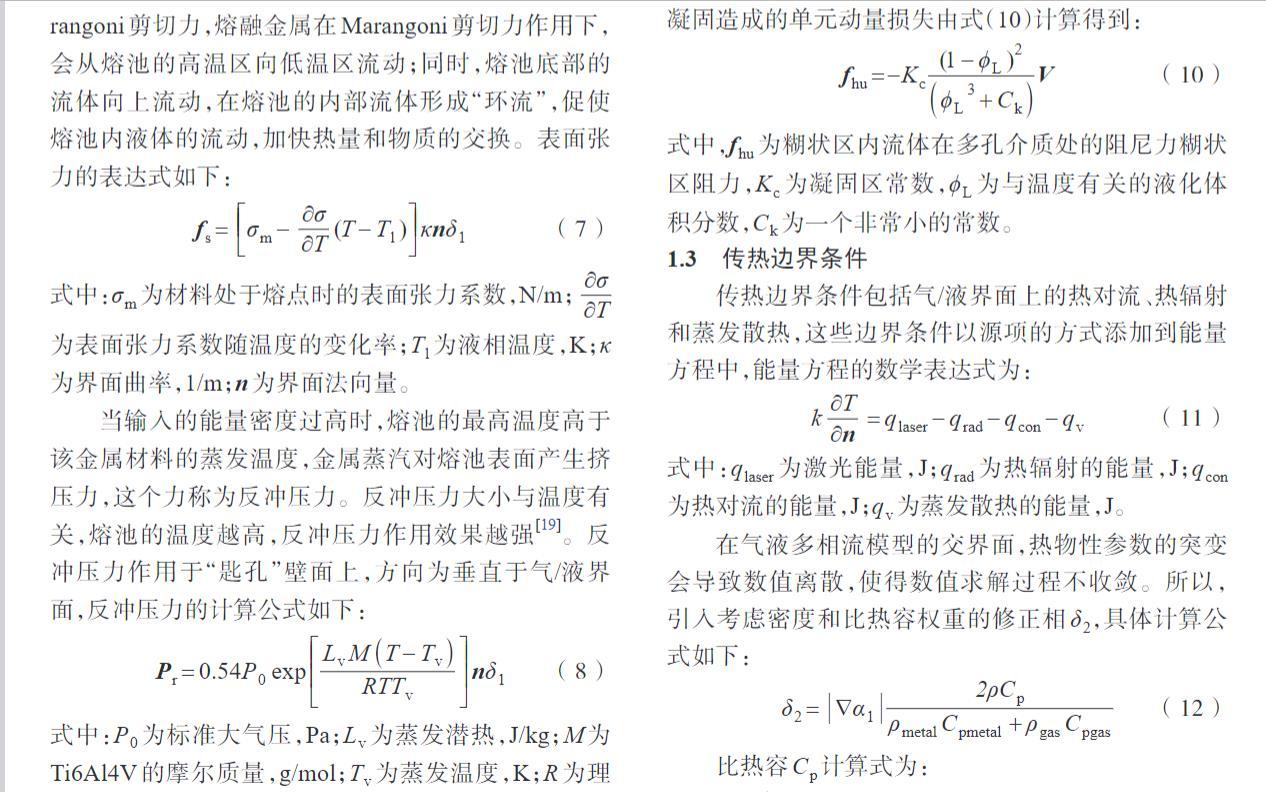當(dāng)輸入的能量密度過高時,熔池的最高溫度高于該金屬材料的蒸發(fā)溫度,金屬蒸汽對熔池表面產(chǎn)生擠壓力,這個力稱為反沖壓力。反沖壓力大小與溫度有關(guān),熔池的溫度越高,反沖壓力作用效果越強(qiáng)。反沖壓力作用于“匙孔”壁面上,方向為垂直于氣/液界面,反沖壓力的計算公式如下: